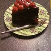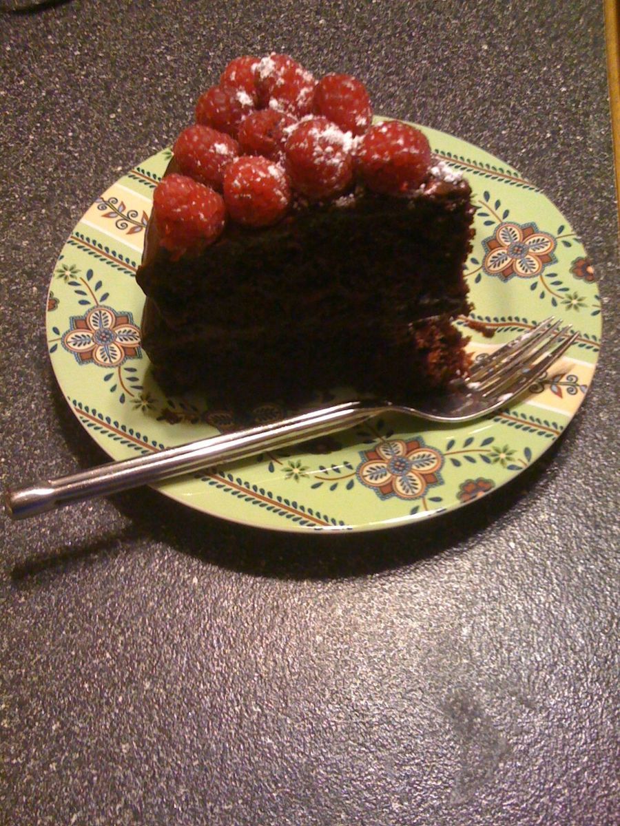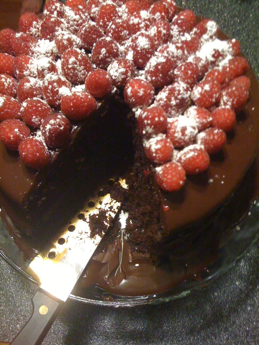 FRESH RASPBERRIES, POWDERED SUGAR, CHOCOLATE GANACHE, CHOCOLATE CAKE