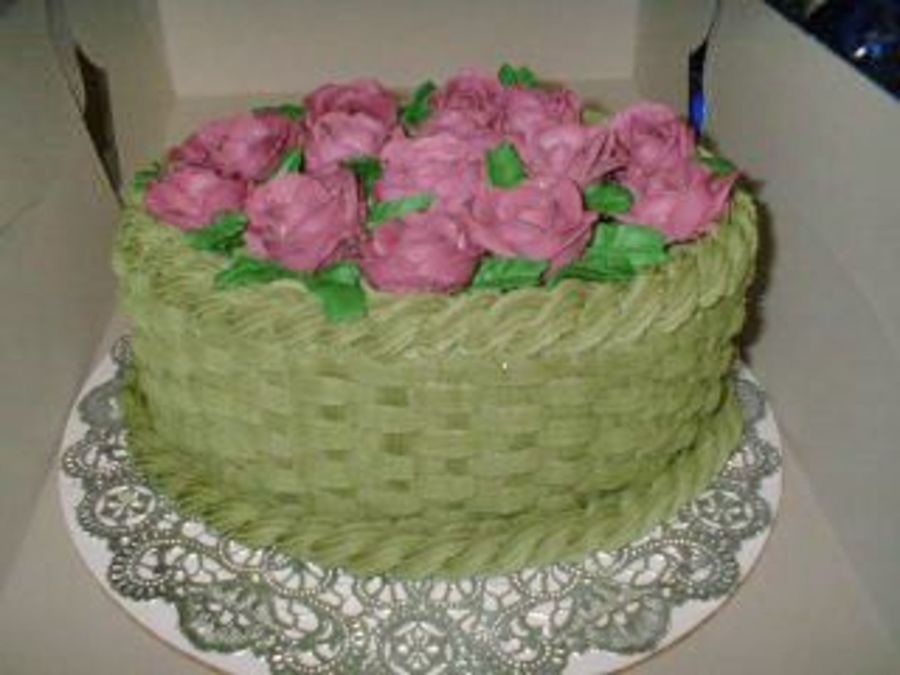 I made this for a friend who saw one of my basketweave cakes and hinted she'd like to have one. It's a lemon cake with buttercream icing. I used sparkle dust on the roses, but it doesn't show up on the photo.