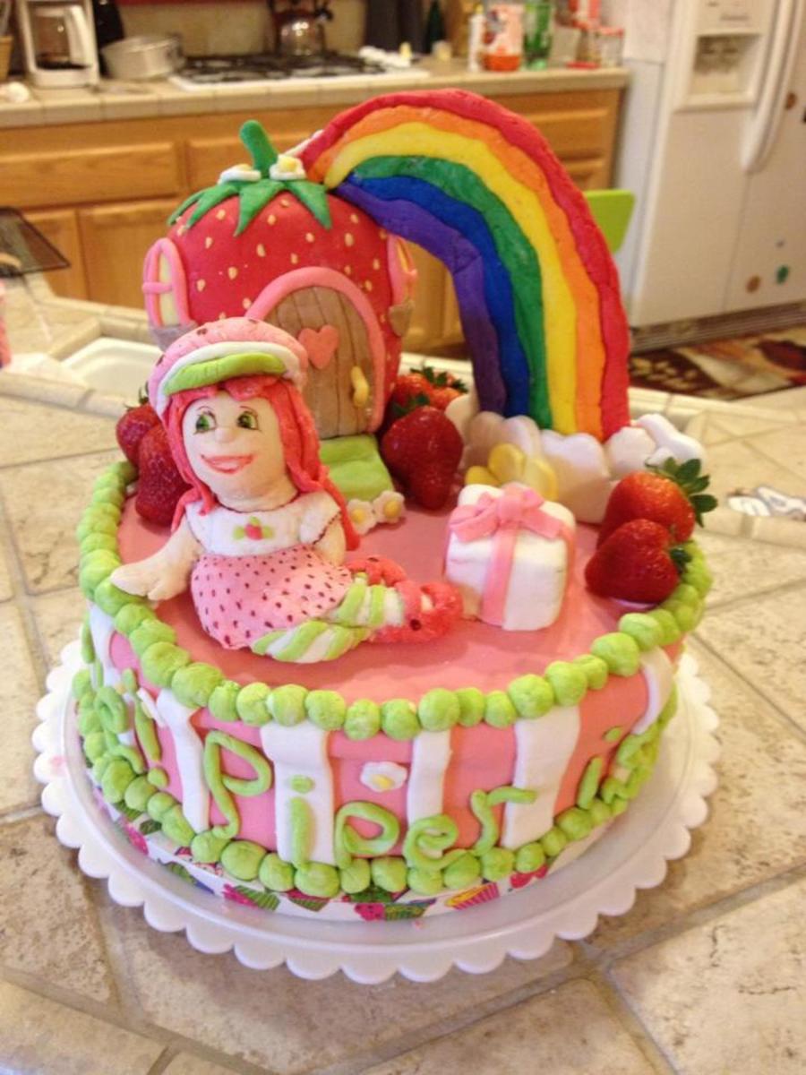 What could be better for a Strawberry Shortcake birthday than a strawberry cake with strawberry frosting? This is a 2 layer 10" cake with MMF. (I had issues with sagging due to the weight of the decorations on top... should have put supports in). Strawberry Shortcake, and her house, and the small present are all made of fondant covered rice crispy treats. The rainbow in fondant over cardboard. This was a very sweet cake for a very sweet girl.