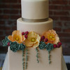 Camel colored fondant with sugar succulents, raspberries, and Icelandic poppies.