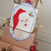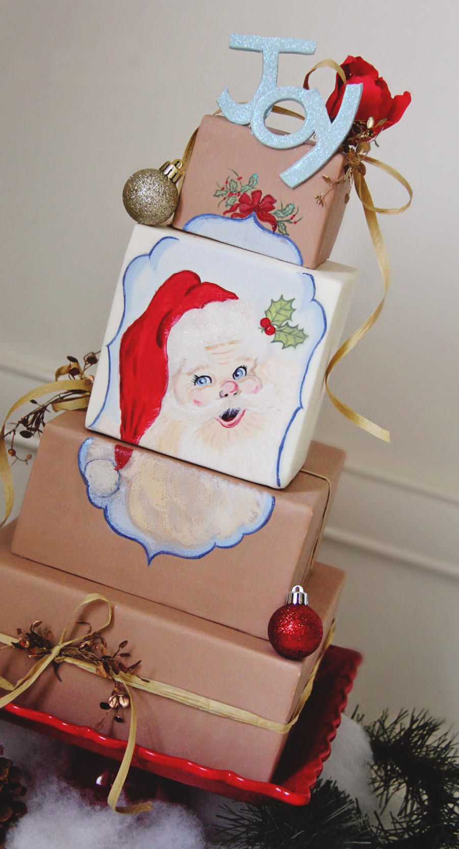 Vintage Santa hand painted on square tiers made to look like presents wrapped in brown paper. Made for the Half Baked Cake blog. See more photos and read about the specific inspiration for this cake at http://www.thecakeblog.com