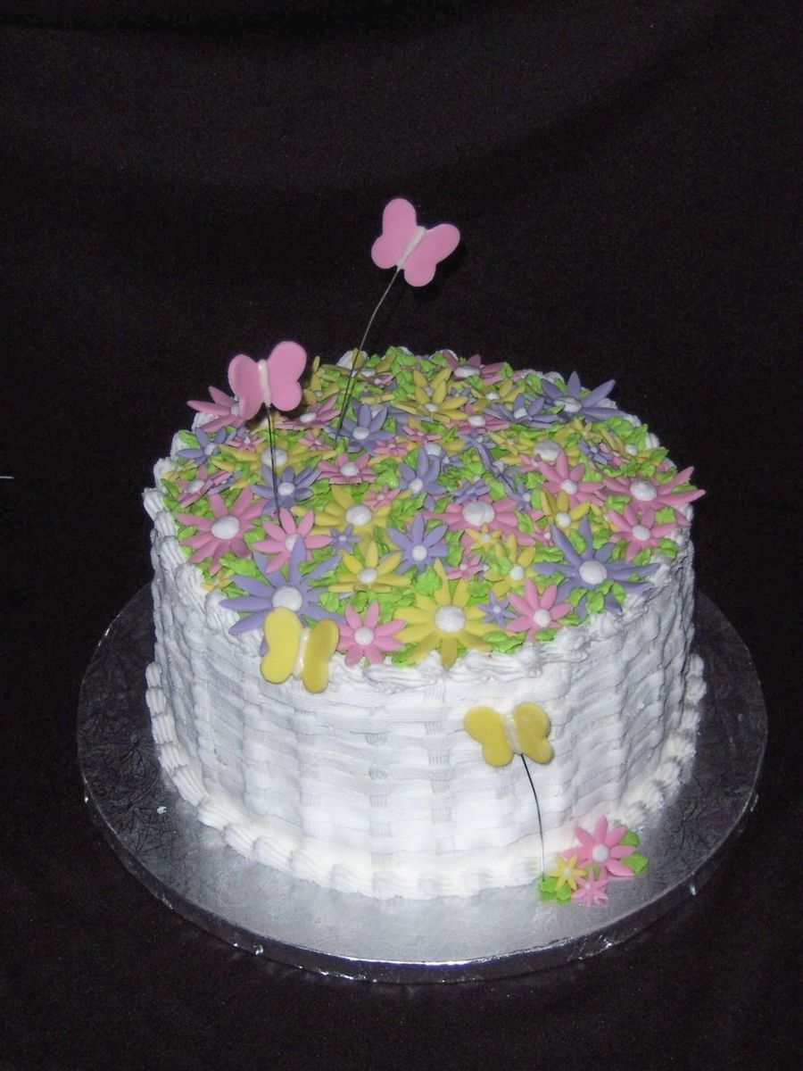 This cake was for a 91st birthday celebration. The basketweave and leaves are done in buttercream. The flowers and butterflies are fondant