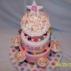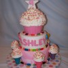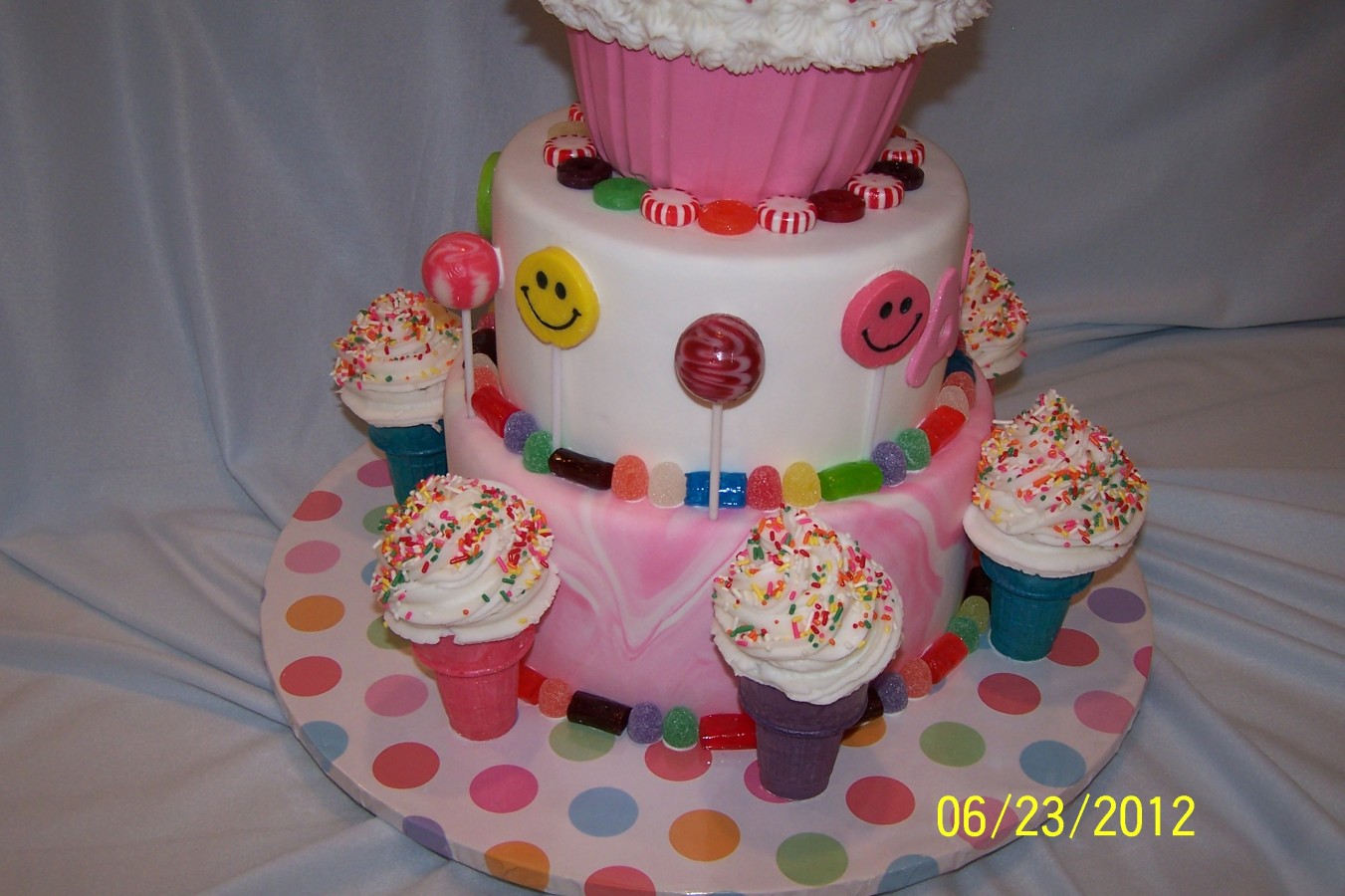 Made this cake for my grand-daughter's 4th birthday in June. Two tiers with a giant cupcake topper. Bottom tier is banana pound cake with butter cream filling, middle tier is chocolate with chocolate ganache filling and the cupcake is also chocolate. Covered with ganache and then all tiers are covered with fondant. The top of the cupcake is covered with butter cream sprinkles added. The borders around the tiers are candy and the star is gum paste. The middle tier has suckers/lollipops around it for decoration. The ice cream cones are real waffle cones that came in colors with a chocolate cupcake on top covered with butter cream icing and then a swirl of butter cream with sprinkles on top. Ashley just loved her cake but she thought the icing on the cupcakes was supposed to be ice cream not icing.