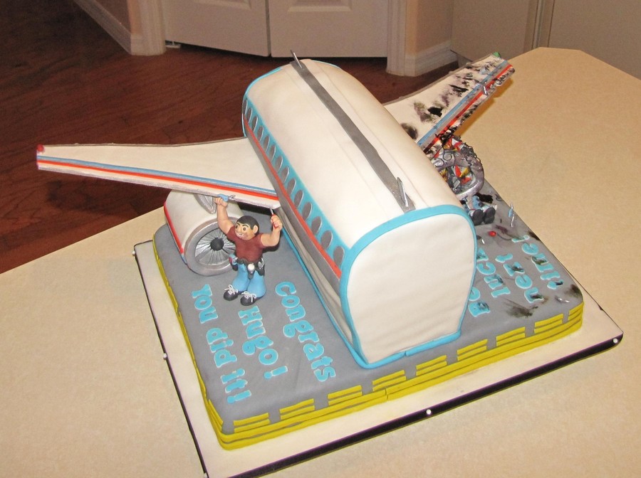A & P Airplane Mechanic. Waiting for results from test to see if he passed or failed. Cake rotated on base to display appropriate side! 100% edible. Wings are made from white chocolate.