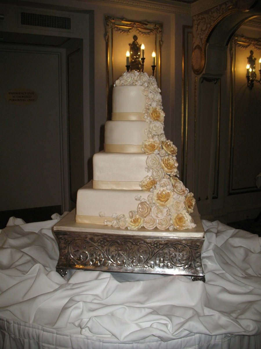 Recent December wedding, all ivory fondant and gp flowers, airbrushed with blend of bronze and pearl to get a slight ivory effect.