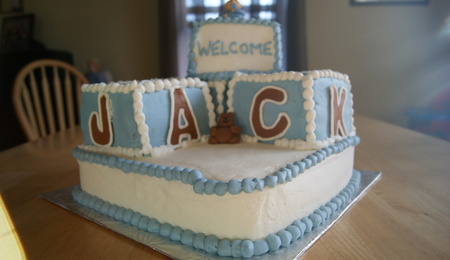 8 inch and 6 inch round cakes covered in buttercream. Bottom tier is piped waves. Sailboat and writing is fondant. The shells are chocolate made from a mold.