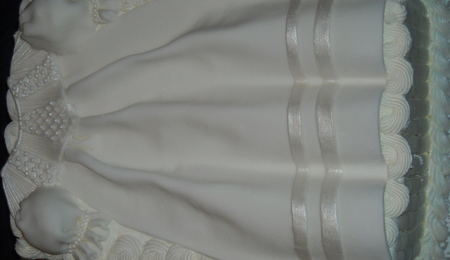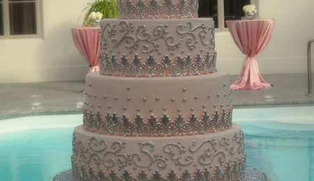 All smooth butter cream cake with hand painted pea**** feathers. Trimmed with sparkle ribbon.