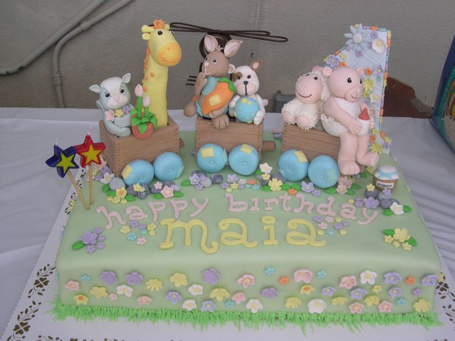 So I finally put together the animal train I made a few months ago for my DD 1st Bday. Marble cake with dulce de leche filling, covered in MMF. Everything is gumpaste except the wagons, which are made out of pastillage. The cake has a "hill" on the right because I forgot to bring my cake leveler but I didn't care (We had this party out of state and I had to bring tools with me) Thanks for looking!!!!