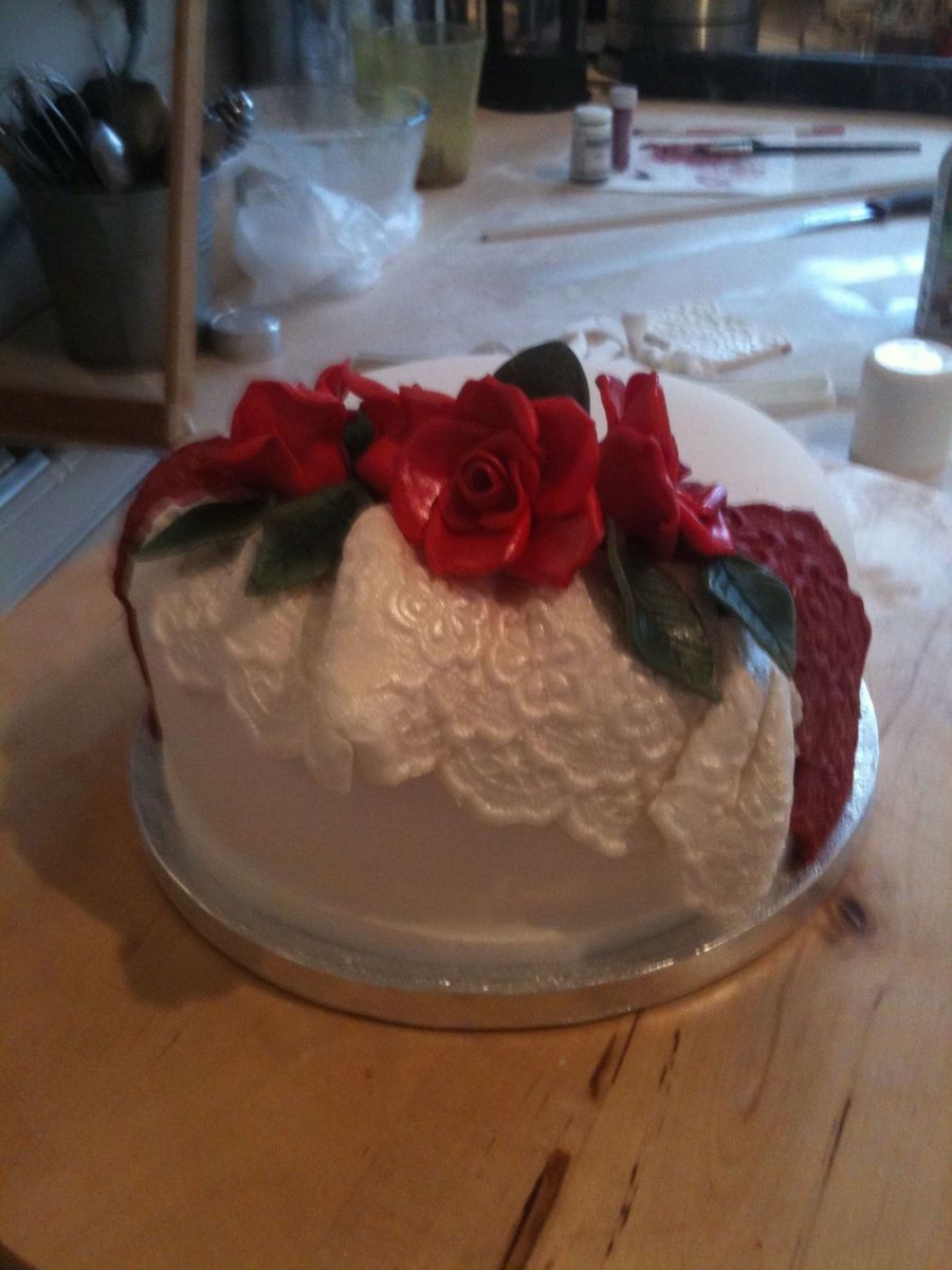 Christmas anniversary fruit cake, covered in fondant and sugar roses