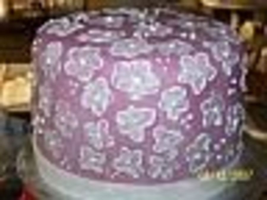 This is my first attempt at a wedding cake, it's only a double layer 6" cake. It is a chocolate cake with buttercream filling, burgandy fondant, and brush embroidery. I LOVE this technique, and wanted to try, my first attempt at ANY decorating. Not too bad, found alot of things I would do differently, just need more practice..