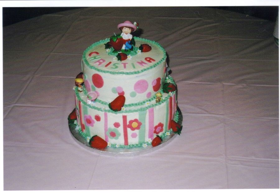 Vanilla cake with fresh strawberry filling and IMBC, iced in IMBC with fondant accents...thanks to all the other Strawberry Shortcake pics that inspired me.