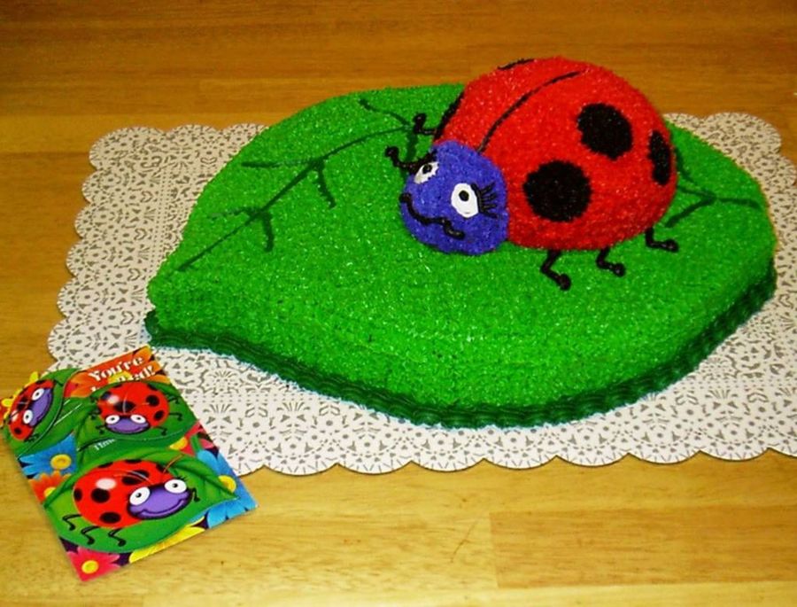 The leaf is from a sheetcake, and the ladybug face is made from Wilton's miniball pan, and the body is from the 3D sports ball pan.