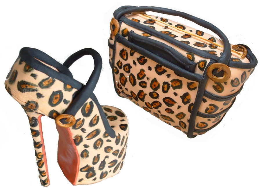 Inspired by Christian Louboutin shoes and purse. Cake is Martha Stewart's yellow buttermilk recipe with chocolate and peanut butter "leopard spots," inside and caramel filling. Shoe is Rice Crispies and fondant.