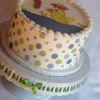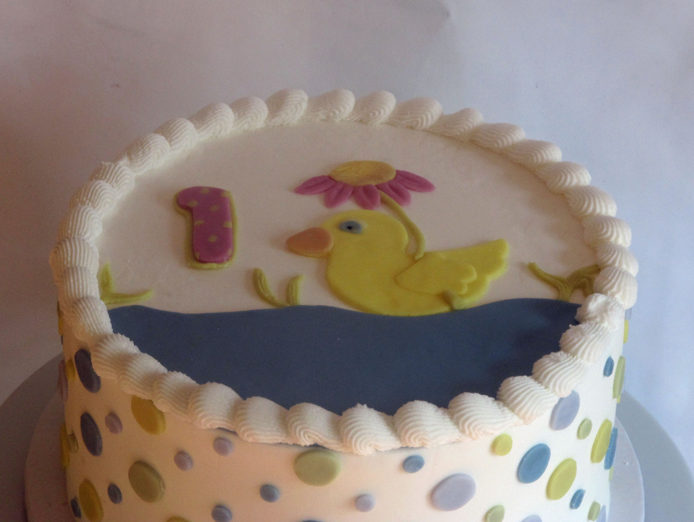 1st Birthday cake inspired by a shower curtain from Target. This cake features all natural food coloring (beets, turmeric, cabbage), no artificial dyes here. The speck of black in the baby duck's eye is from black/forbidden rice. This cake is iced in buttercream and all the accents are done with rolled buttercream.