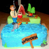 Notice, the shark comes out of the water and takes the fish! The cake is vanilla and chocolate and it is covered with buttercream frosting and fondant. Accents and figures are made with modeling chocolate.