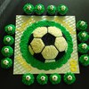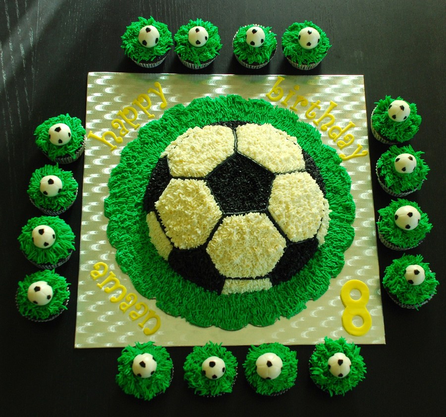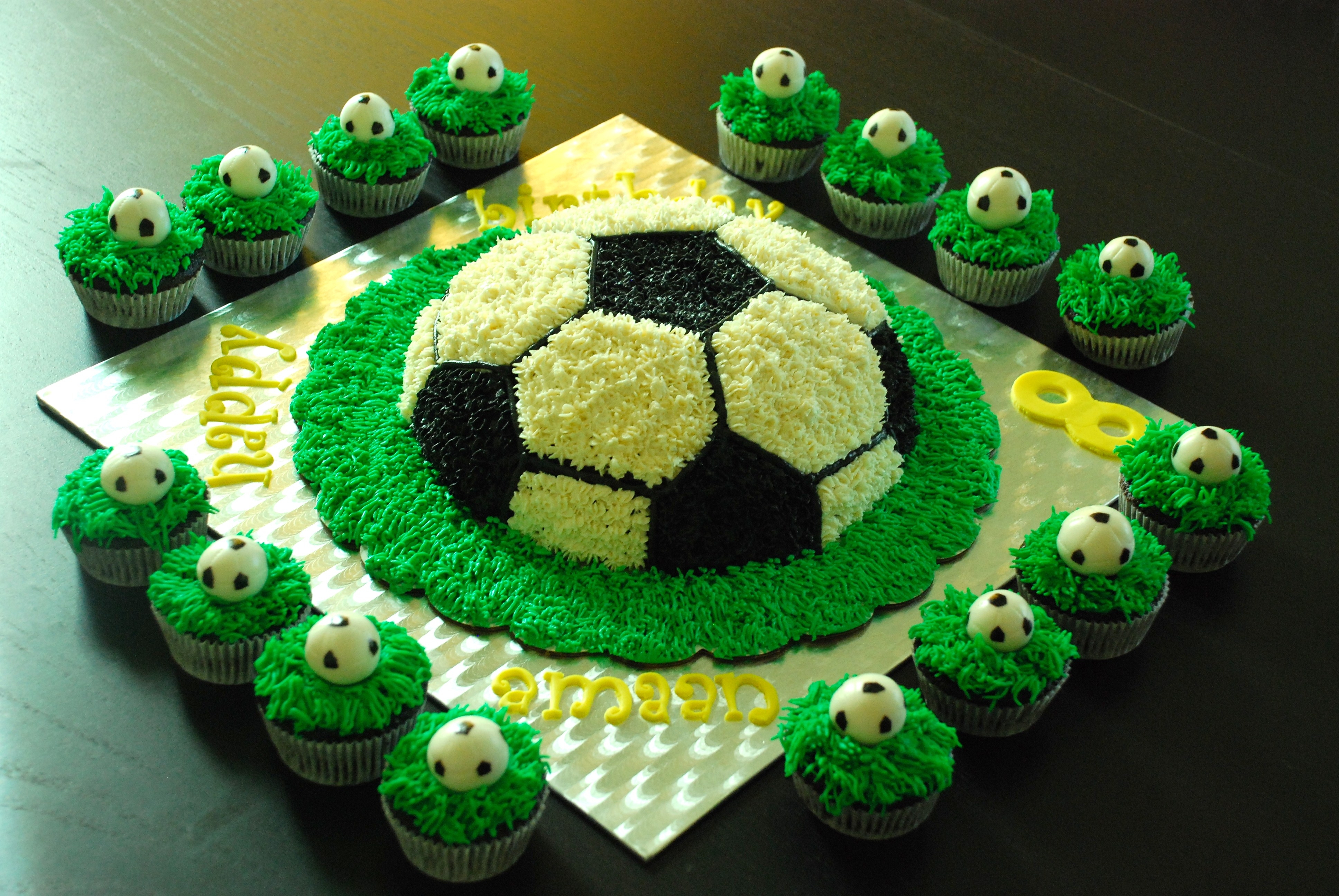 Half soccer ball and soccer cupcakes. Chocolate cake and buttercream frosting