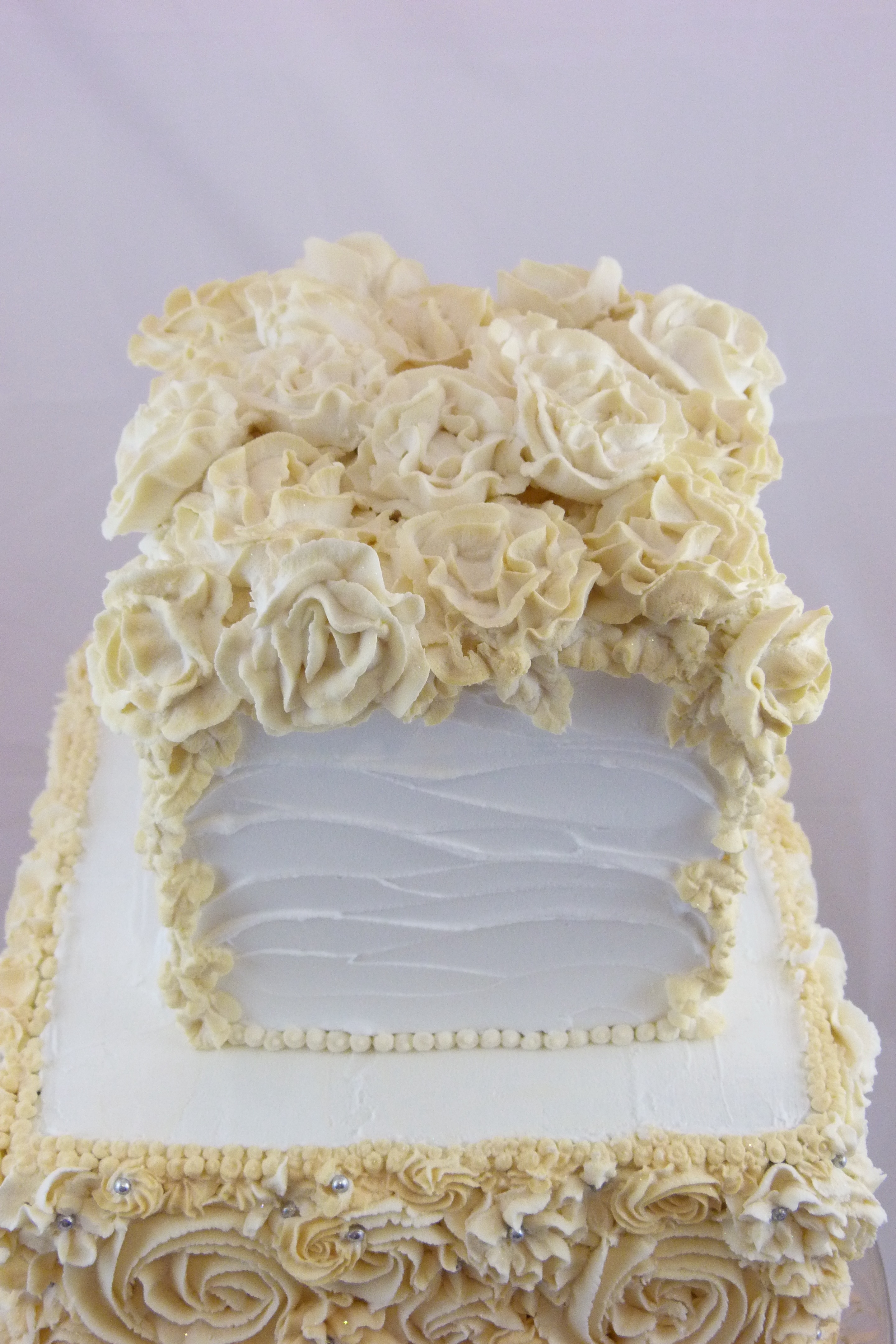 View from an angle of buttercream piped cake in ivory and white