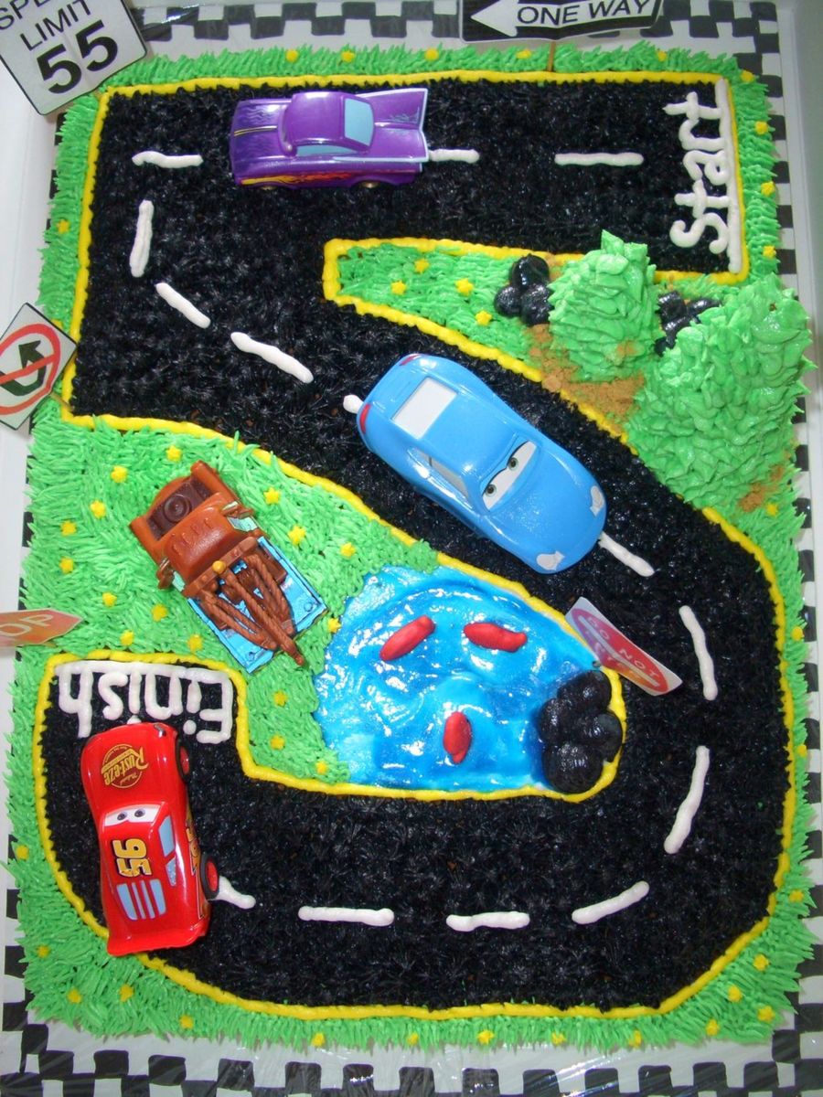 I know my customer found a pic of a cake like this on this site I am just not sure who it belongs to. THANK YOU whoever you are..LOL Anyway it is pretty much self-explanatory..Cars and racetrack in the shape of a number 5. Yellow with buttercream. Ice Cream cone trees. Piping Gel for the water, and fish crackers in the pond.