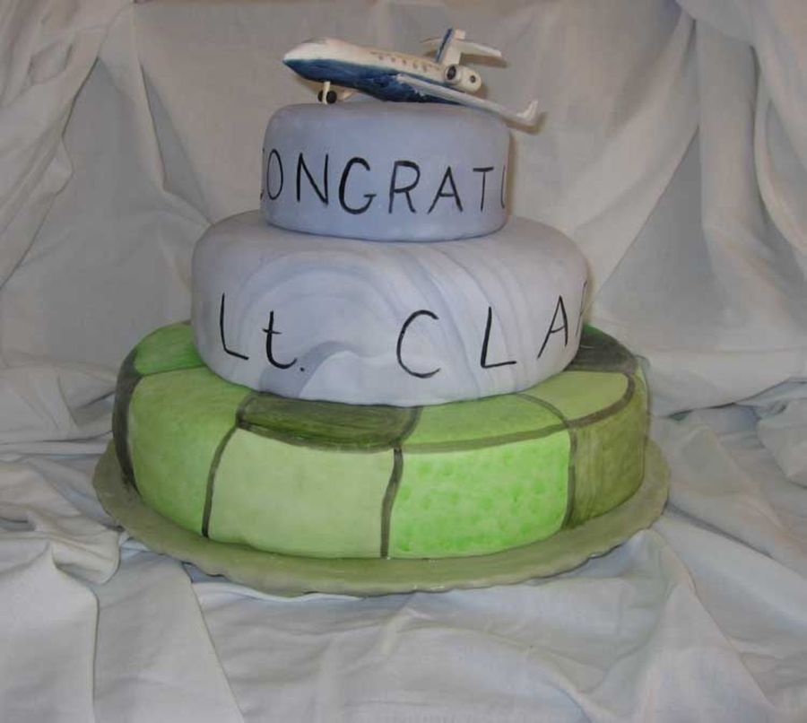 This was done for a friend who was retiring from the air force as a Presidential Pilot. It took me forever to come up with a design and in the end the idea I had was to have the bottom tier as the fields, then move up to the clouds and then up to pure blue sky. I wasn't totally happy with my writing but, you can't have everytihing! Plane is molded out of MMF.