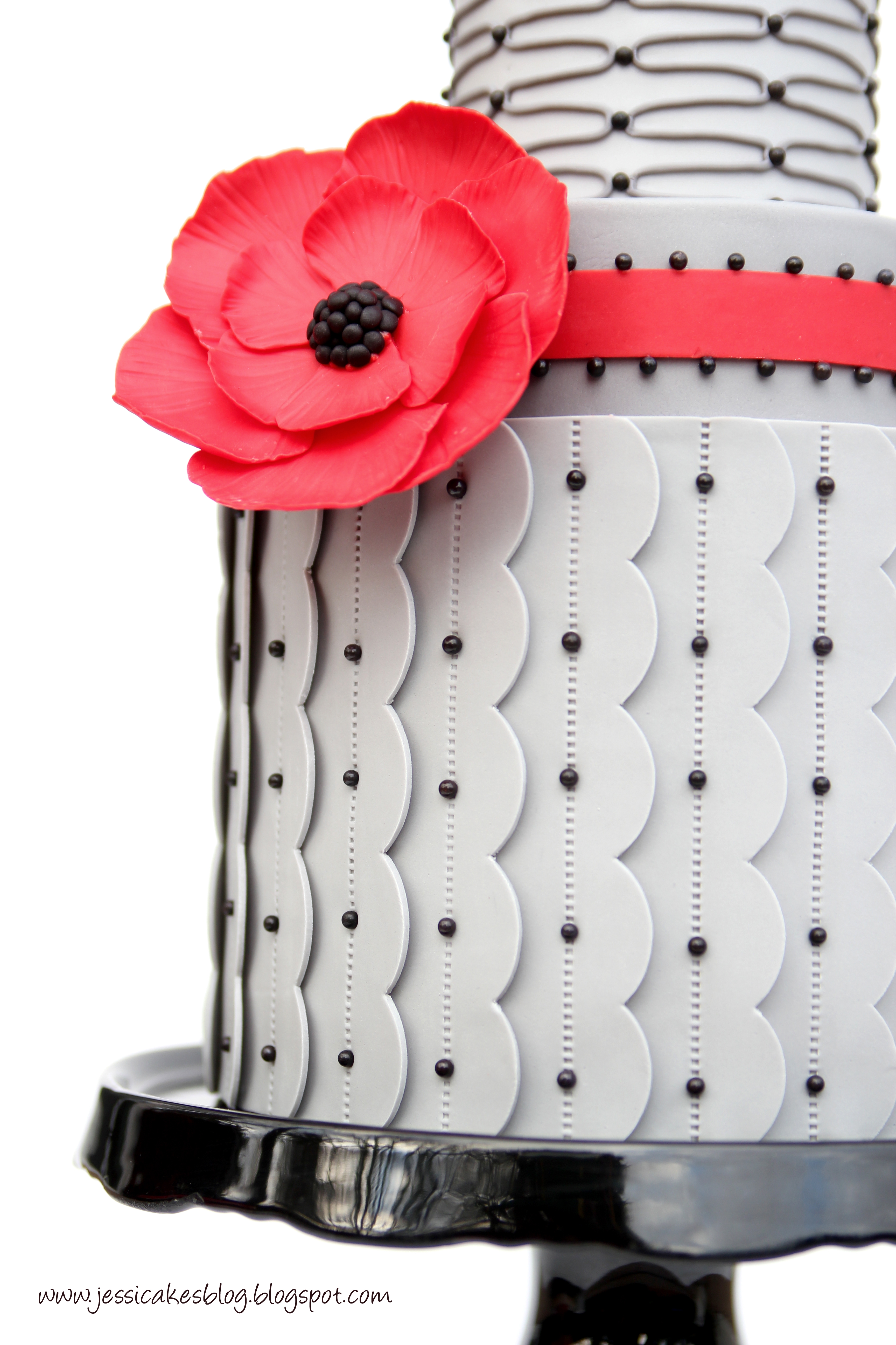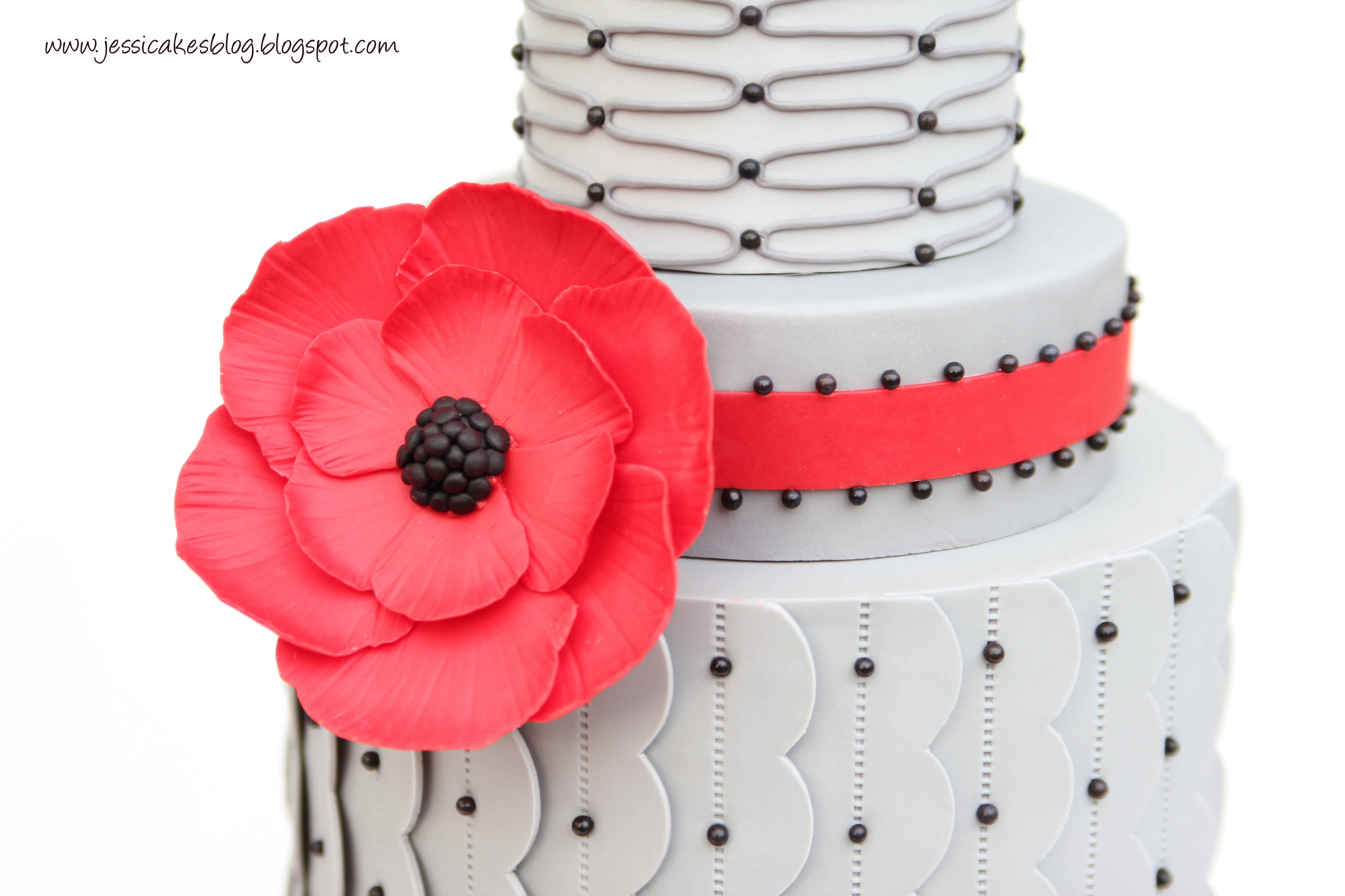 The top tier design was made with extruded fondant, the bottom ruffles are fondant and the flower is made with modeling chocolate. Thanks for looking!