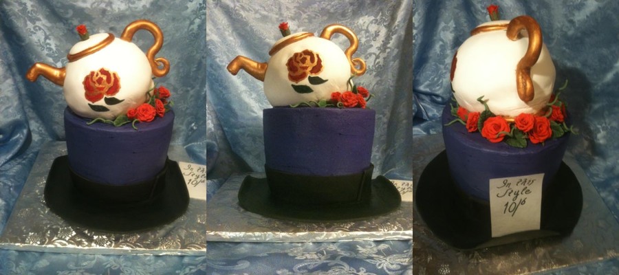 This is what I have spent yesterday and most of today working on. I tried to make the hat look old but it just looks a mess. It is iced in buttercream. The brim and band are fondant. The "sign" is edible rice paper and written with edible ink. Tea pot (which is supposed t look like it is tipping) is covered with fondant and hand painted with edible "paint". Roses are fondant. Had lots of problems with this one. You can see all the wrinkles under the handle from where the cake started slipping, and the purple is turning blue.
