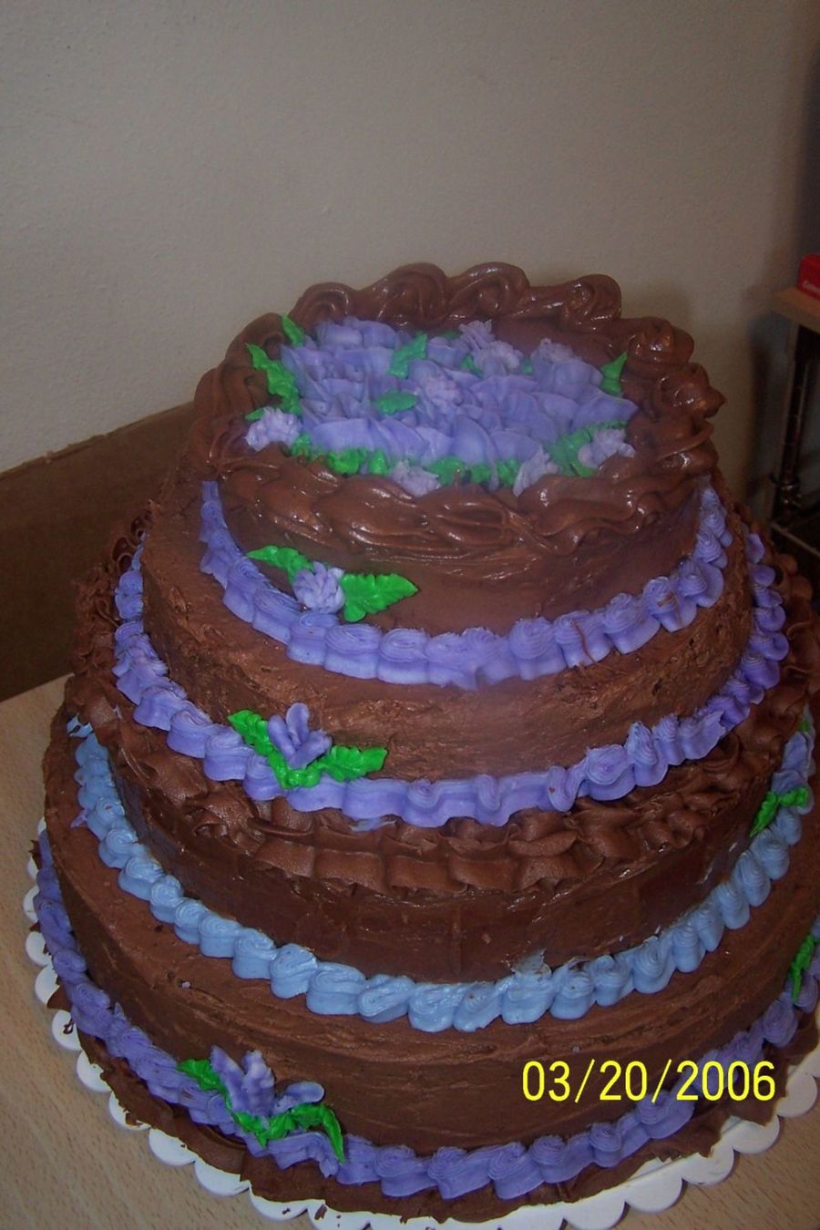 This is the final cake after I tore down the tiers and finished the decorating. It is a 12X3- 10- 8- & 6 inch. The top and third layer are frosted with chocoalte cream cheese icing and the rest is chocolate bc.