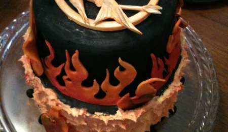 Hunger Games cake for my daughter's birthday. Pin was gumpaste, flames were fondant.