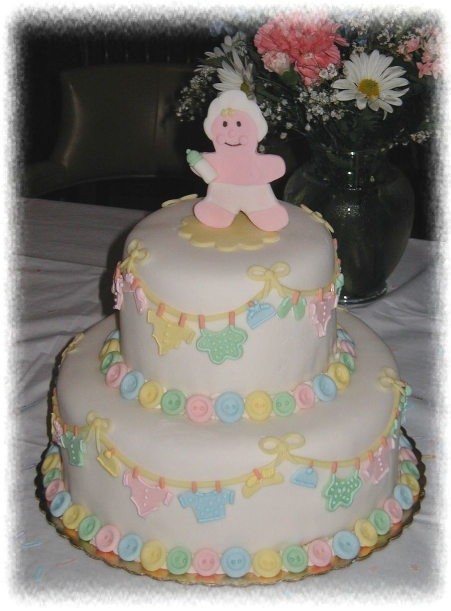 This is a beautiful cake and I have to share......many many years ago I heard a great idea, I can't even remember where from, where you put clothing items on a clothes line and put it in a gift basket for a neat way to give as a gift. At my sister-in-laws baby shower I filled a line with clothes and hats, socks and wash cloths etc. and put in in a bag I found that had a baby's clothes line on it. That would go perfect with this cake.