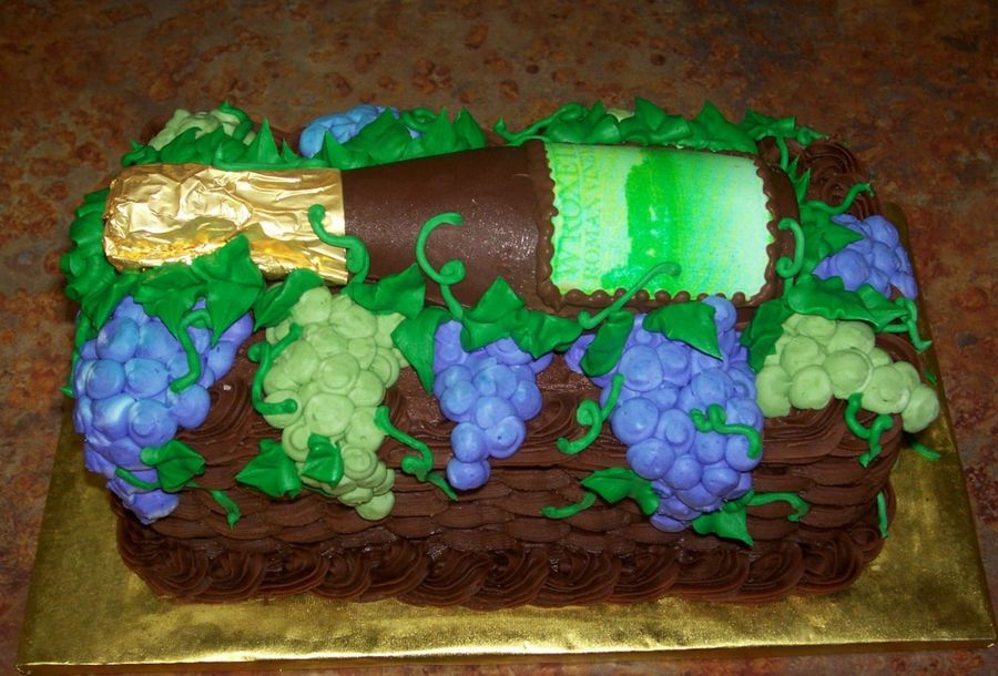 This cake was made for the Food and Wine Market where I bake. The bottle was made from a chocolate mold, downloaded an old wine label from the internet onto an edible sheet and attached with melted chocolate. Gold wrapper is from Wilton's candy items. Basketweave on the sides with BC grapes.