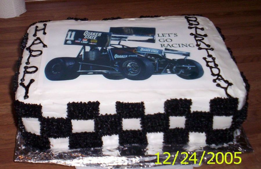 I did this for my father-inlaw who loves sprint cars. This was my first print. I got it done at a local store. I now know to line up my words better, still not to great at the whole writing thing, any tricks? I also learned not to put the cake in an airtight container after putting the print on, it made the color run on the print by morning, so when I took it to the party the white part of the paper was a pale blue.
