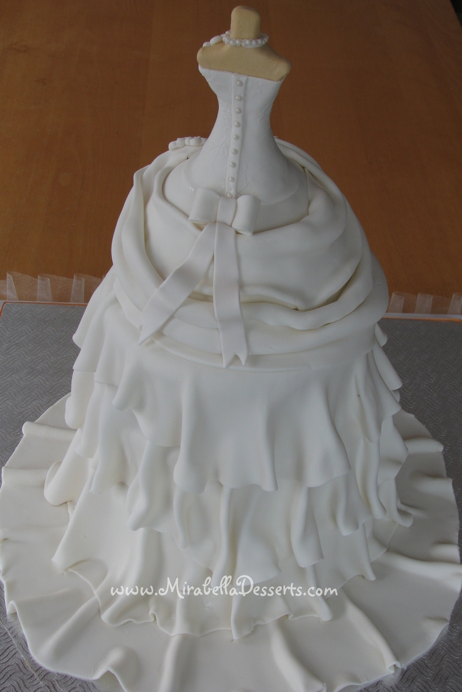 A 4-tier wedding dress cake made for a recent bridal shower. The bride-to-be's sister wanted an original shower cake that would reflect her sister's personality - unique, creative and elegant.