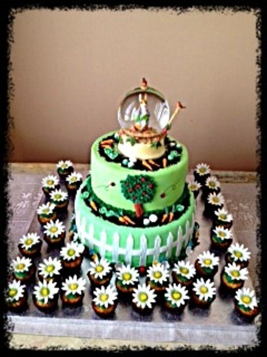 Baby Shower cake in the Peter Rabbit theme. All fondant with the addition of the Peter Rabbit waterglobe as the topper.