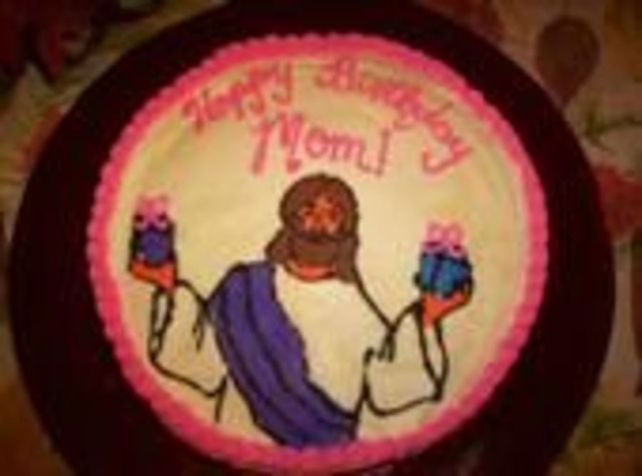 This is a frozen buttercream transfer on red velvet (what else?) that I did for my mom's birthday. I'm kind of new to cake decorating, and I just discovered transfers. I had been making theme cakes for everyone's birthday this year based on what they were "into." It was my mom's suggestion to do Jesus.