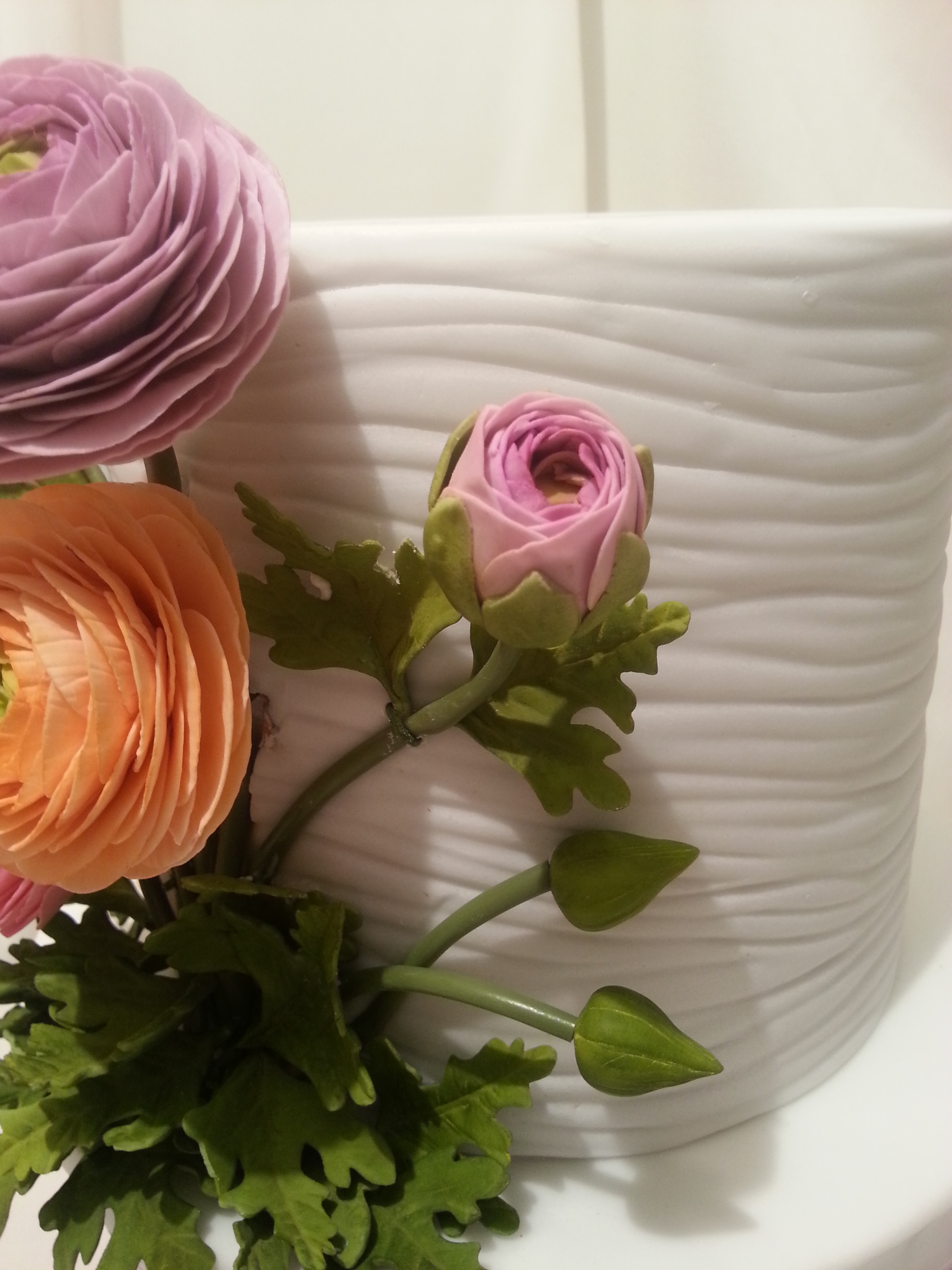 Happy Mother's Day! Four layer chocolate cake with Caramel, Raspberry & Vanilla Swiss meringue butter cream wrapped in a layer of drk choc. ganache and fondant. Ranuculus gumpaste flowers and leaves. Thank you Erin of ThreeLittleBlackbirds for your wonderful tutorial on ganache. There is a slice of the cake in the detail photos. Thank you for looking