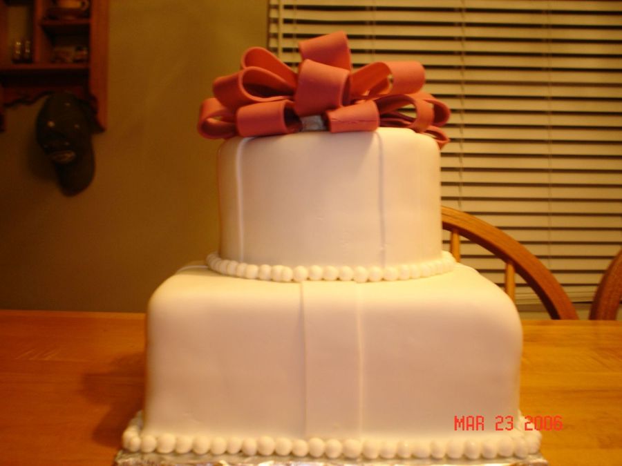 Im proud that this came out as good as it did,for my 1st fondant bow and fondant tiered cake. I know that there is many imperfection but that means there is room for improvements. Top tier is a yellow cake, 2nd tier is a vanilla cake. Both with bc icing and mf.