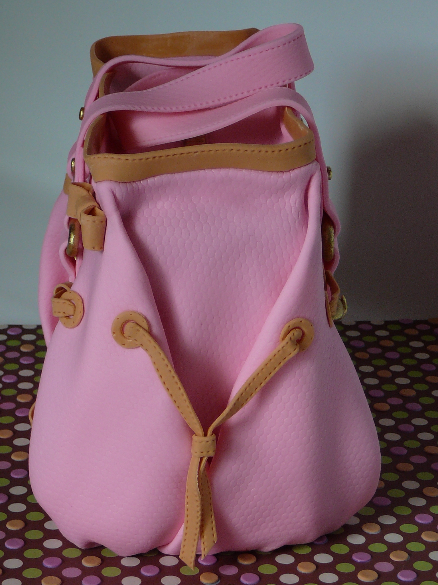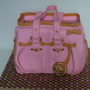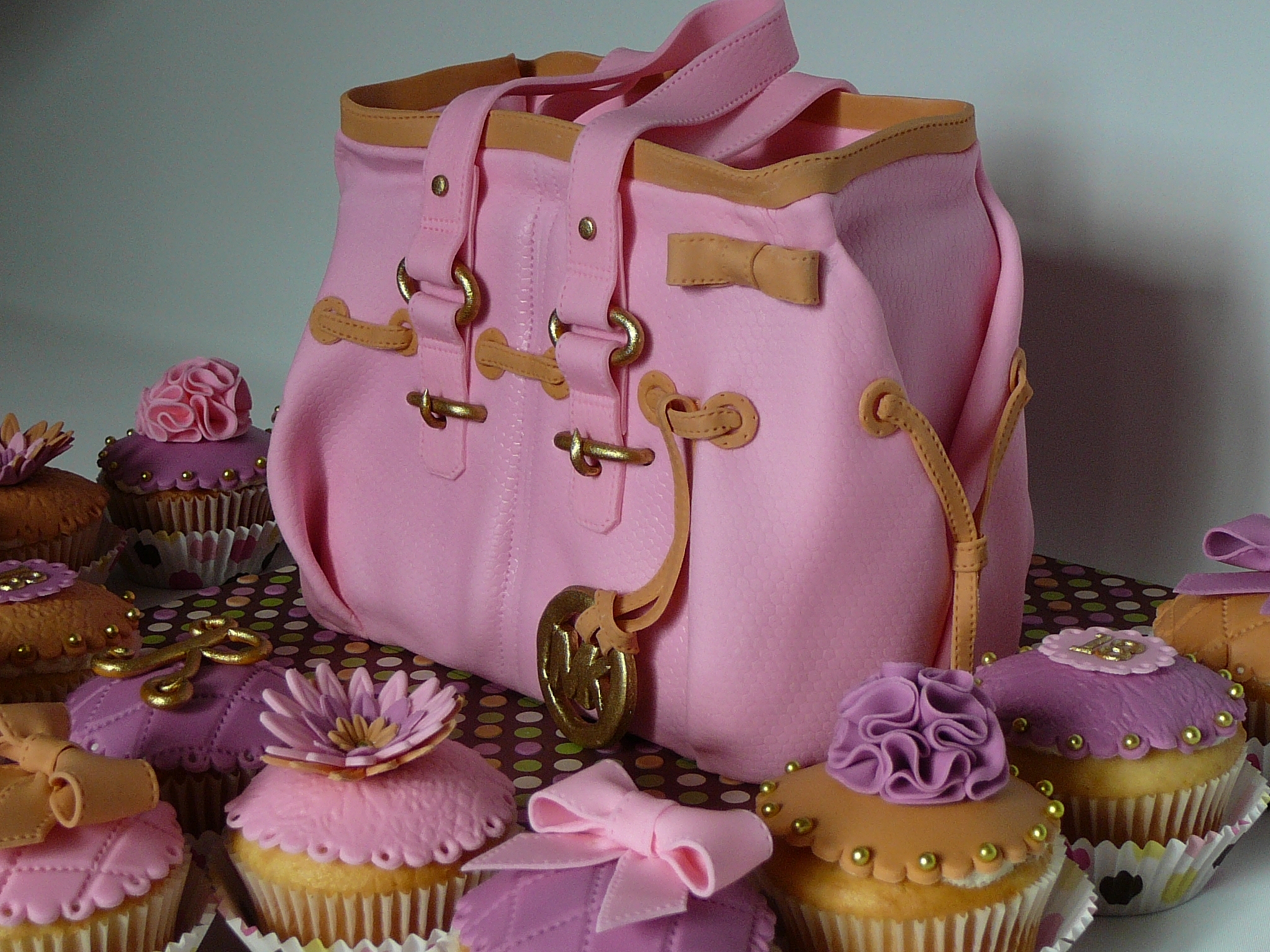 This is a chocolate cake with chocolate ganache all covered with fondant. I embossed the fondant with tulle fabric to give the leather texture. Gold luster dust with vodka for the gold parts. There is also some cupcakes decorated to match the cake.