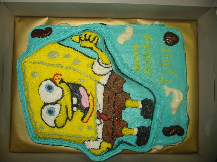 Yellow and white half sheet cake with a chocolate spongebob stacked on top. All covered in buttercreme icing with molded chocolate shells, dolphins and seahorses and covered in gold luster dust. Thank you Tray2 for allowing me to use your design.