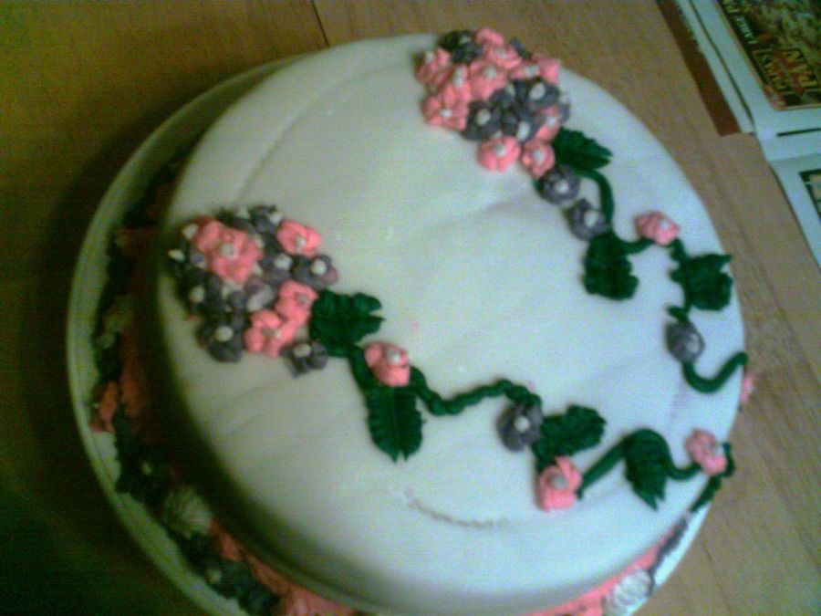 My first cake with fondant and flowers. Not great and you can see where I was playing with the embossing tool on top.