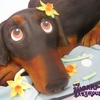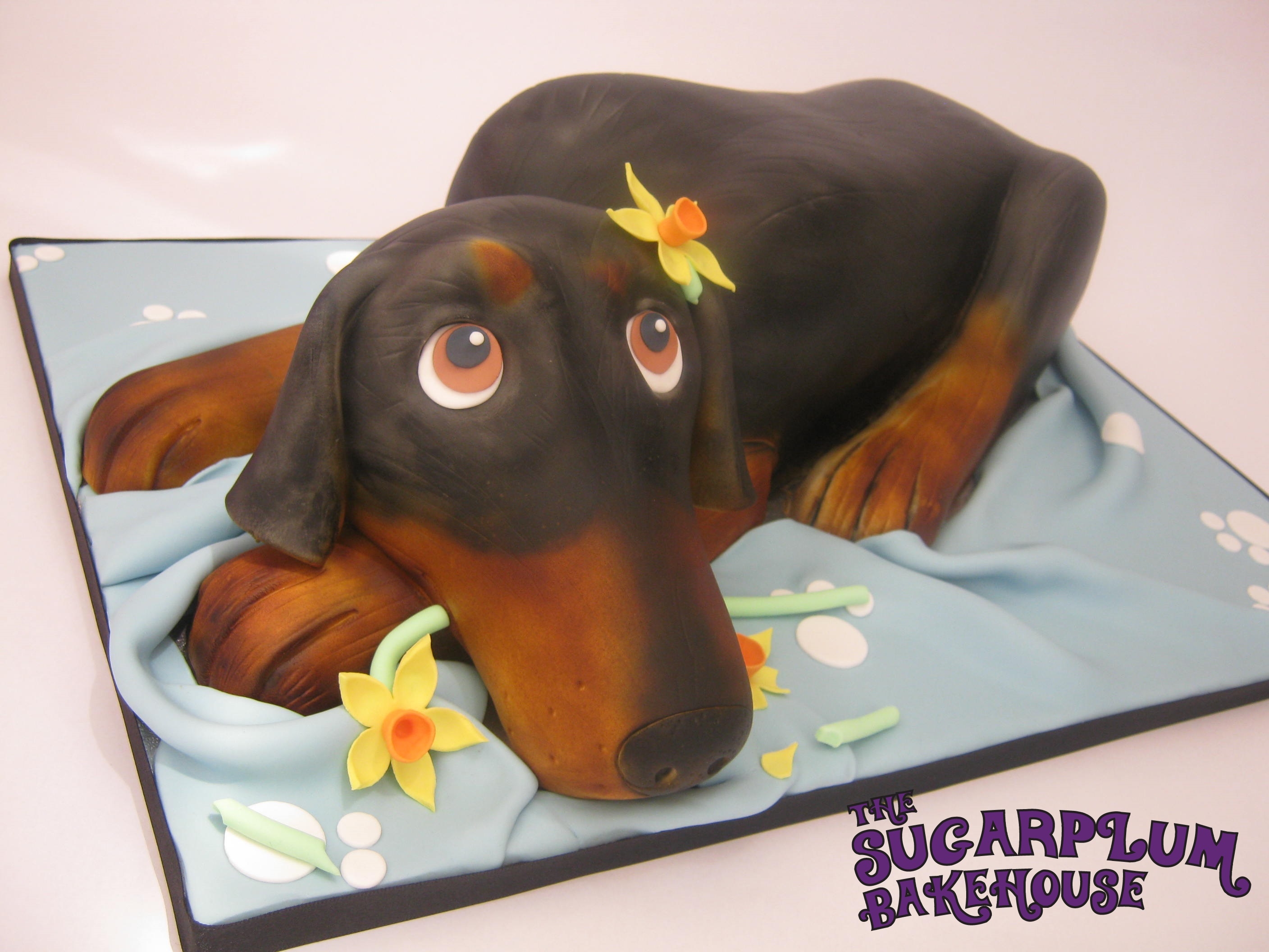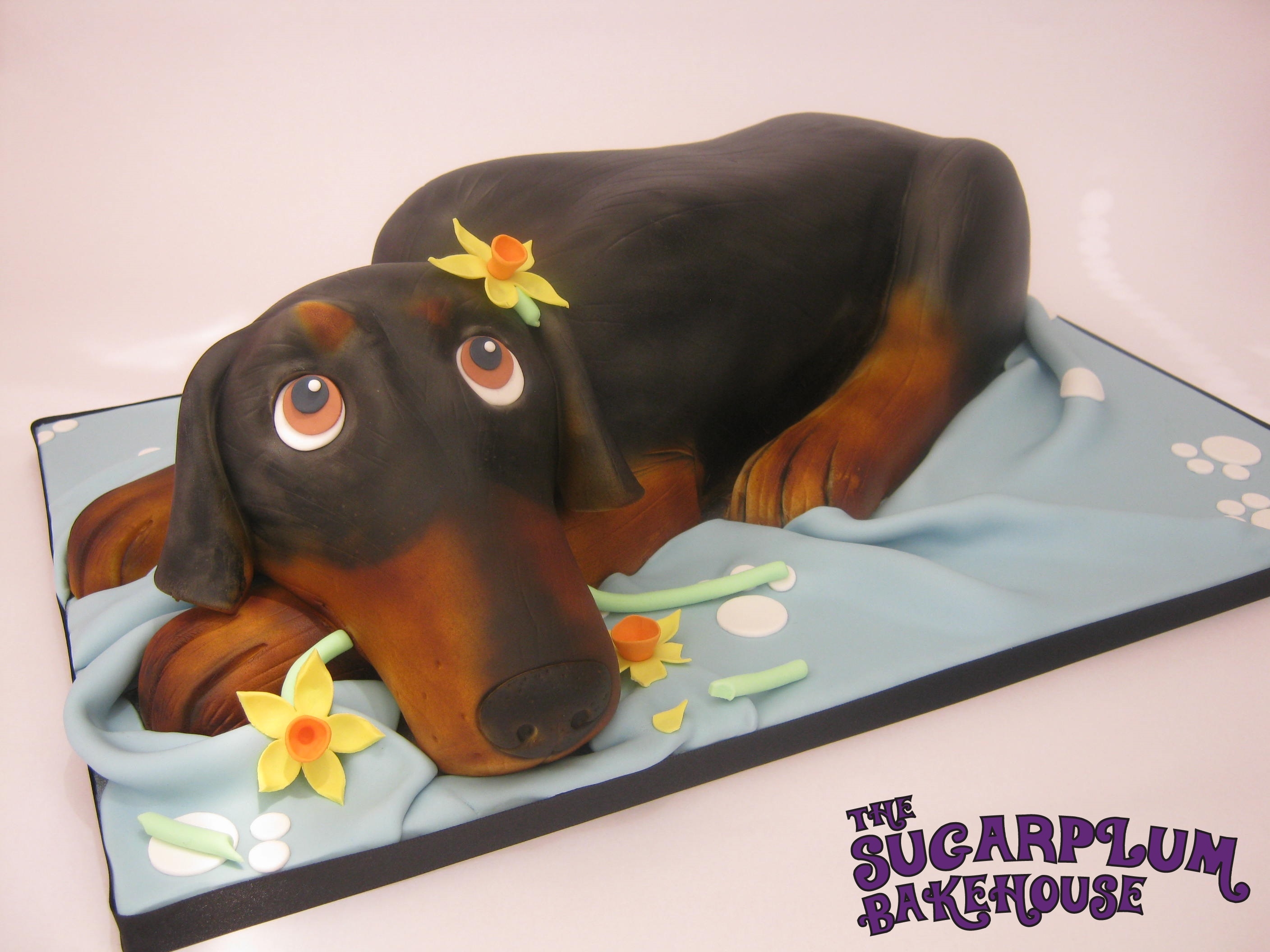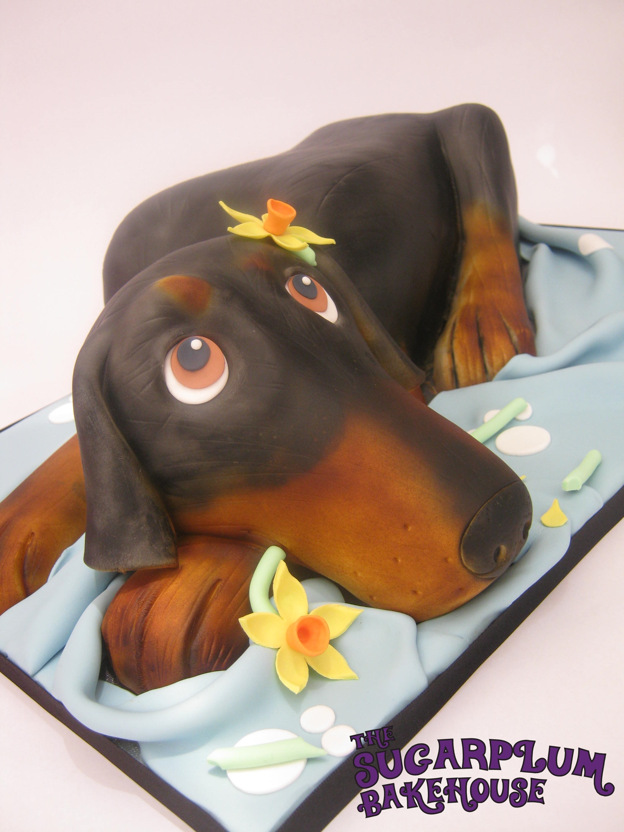 Meet Khan the Doberman! This cake was hand carved from 3 rectangular chocolate cakes and stacked with chocolate buttercream and crumb coated in a belgian chocolate ganache before being covered with fondant and airbrushed to resemble a Doberman's markings. The head is sculpted from RKT. The couple also had some daffodil topped wedding cupcakes so I added the 'chewed' Daffodils to help tie the 2 designs together.