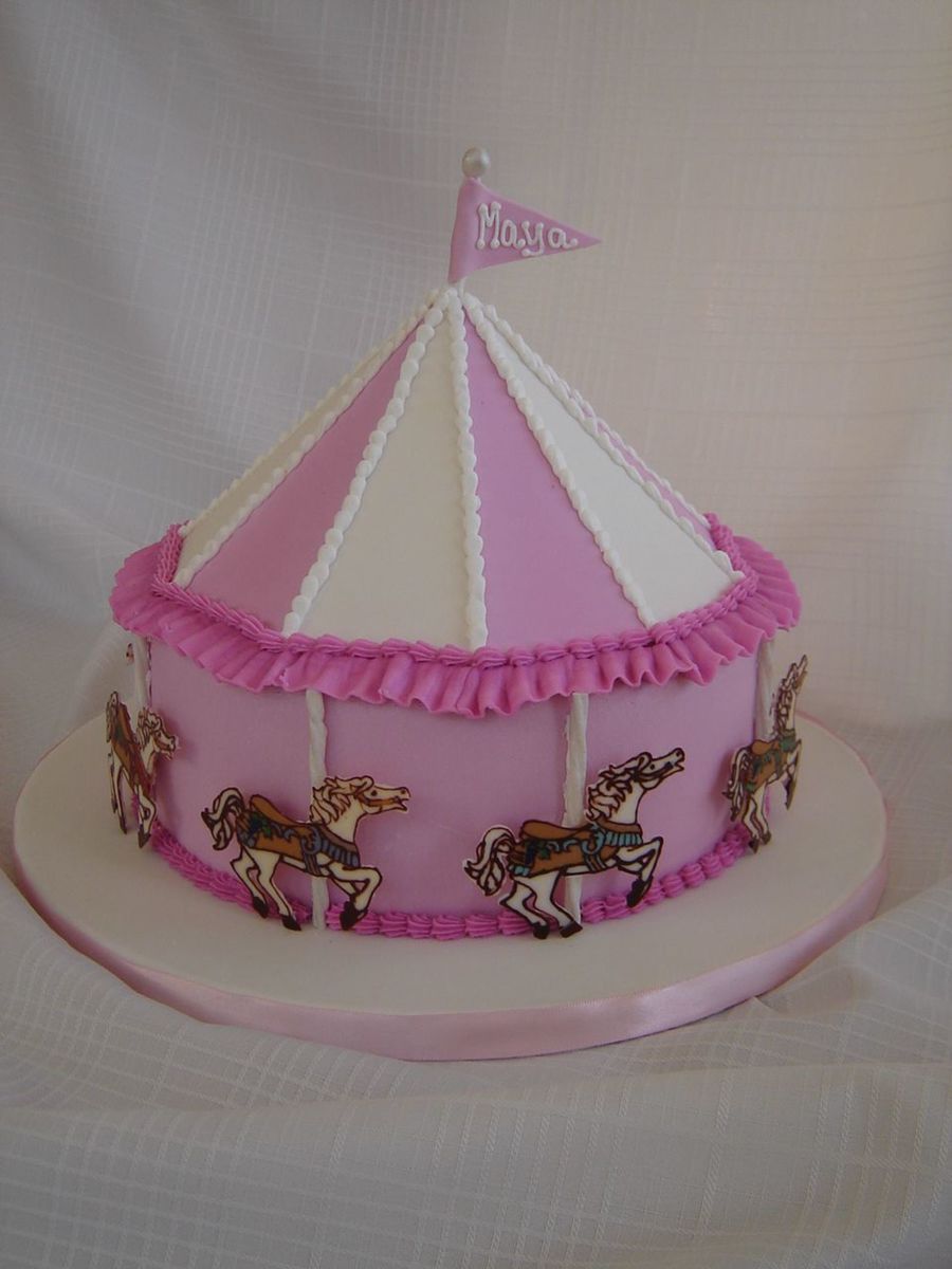 This is for a 4 year old girl, friends of the family. My first inspriation was from the Frosting with Flair wesite (just love her work!) I also used the wilton 2007 yearbook for the awning (though the template is WRONG!) I had to have my DH help me with the engineering for the awning as I found it needed to be very precise! I am pretty happy with the outcome, but I do not know if I would want to make this cake again!! The horses are chocolate transfers. Thanks for looking!