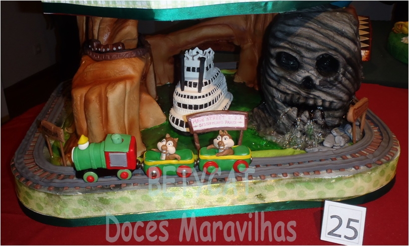 This cake was definitely the biggest challenge I’ve had to date and I felt a great satisfaction to finish it. I tried to pay homage to Disneyland Paris in all its magnitude. In it are represented the Disneyland Park and Walt Disney Studios Park , with some of its major attractions, from the charts, buildings, through the carousels and characters, ending, as might be expected, with the figure of Mickey that symbolizes all Disney magic.
