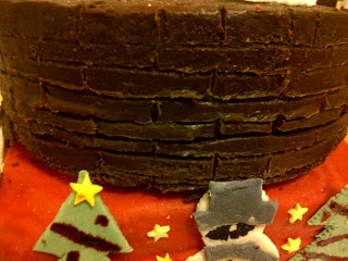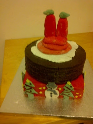 This was my 2012 Christmas cake for my family! I went for a Santa stuck in the chimney theme that I saw on this site although my Santa legs totally didn't go right!! The 'chimney' was covered in chocolate ganache and it was the first time that I had tried it and it was amazing!! Highly recommend using chocolate ganache =D
