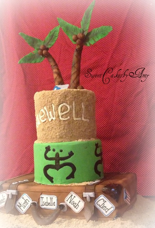Family is moving to Puerto Rico to pursue Missionary work. Top and middle tier are chocolate/chocolate chip cake with chocolate ganache. Bottom tier french vanilla with raspberry creme filling covered in white chocolate ganache. Cake stand is a actual suitcase! =-)*