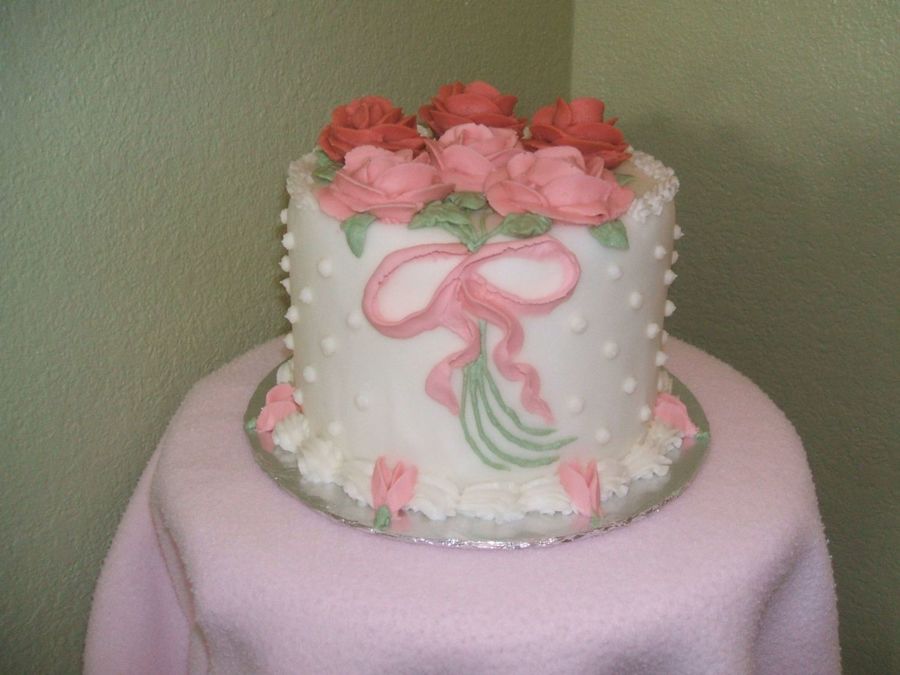 Nuh-uh!!! This is NOT your first cake! Roses look great! Icing is very very smooth! Your dots look like they have peaks .... if you dip your finger in powered sugar, then lightly touch each dot, it will "smash" down the point and make them more rounded. Great job!