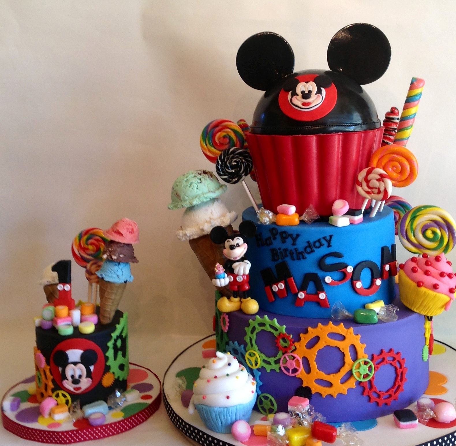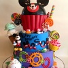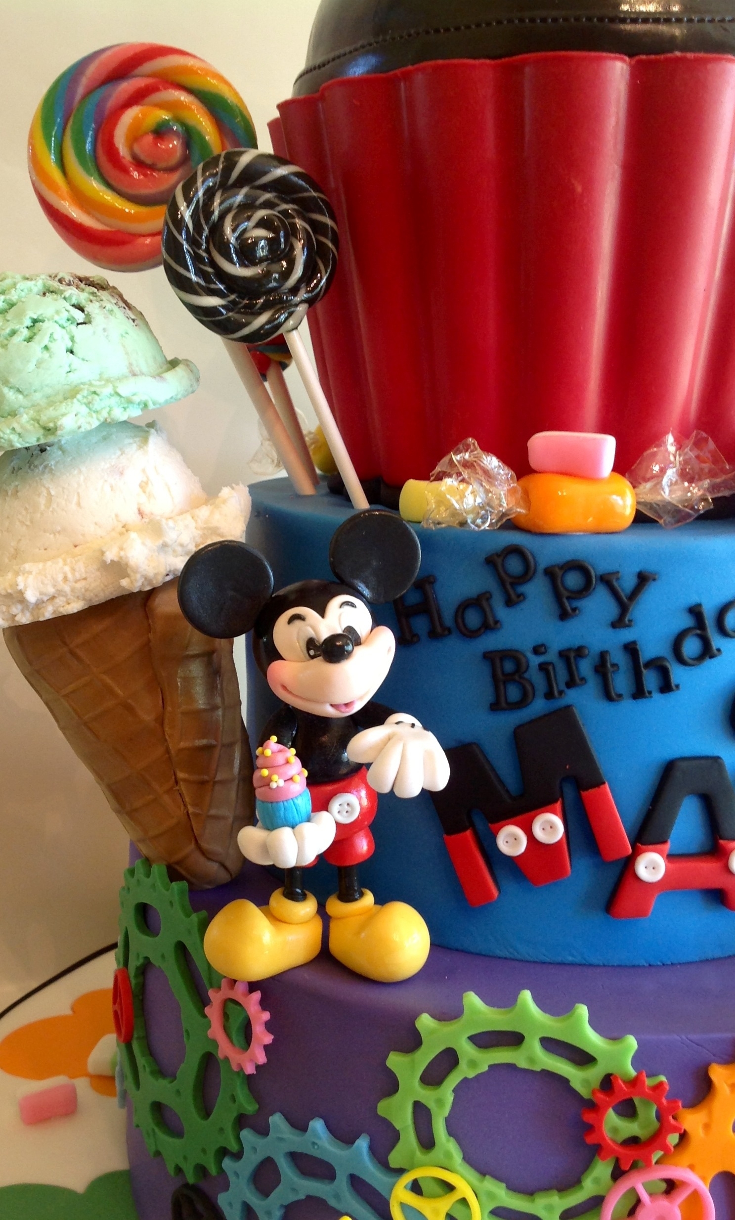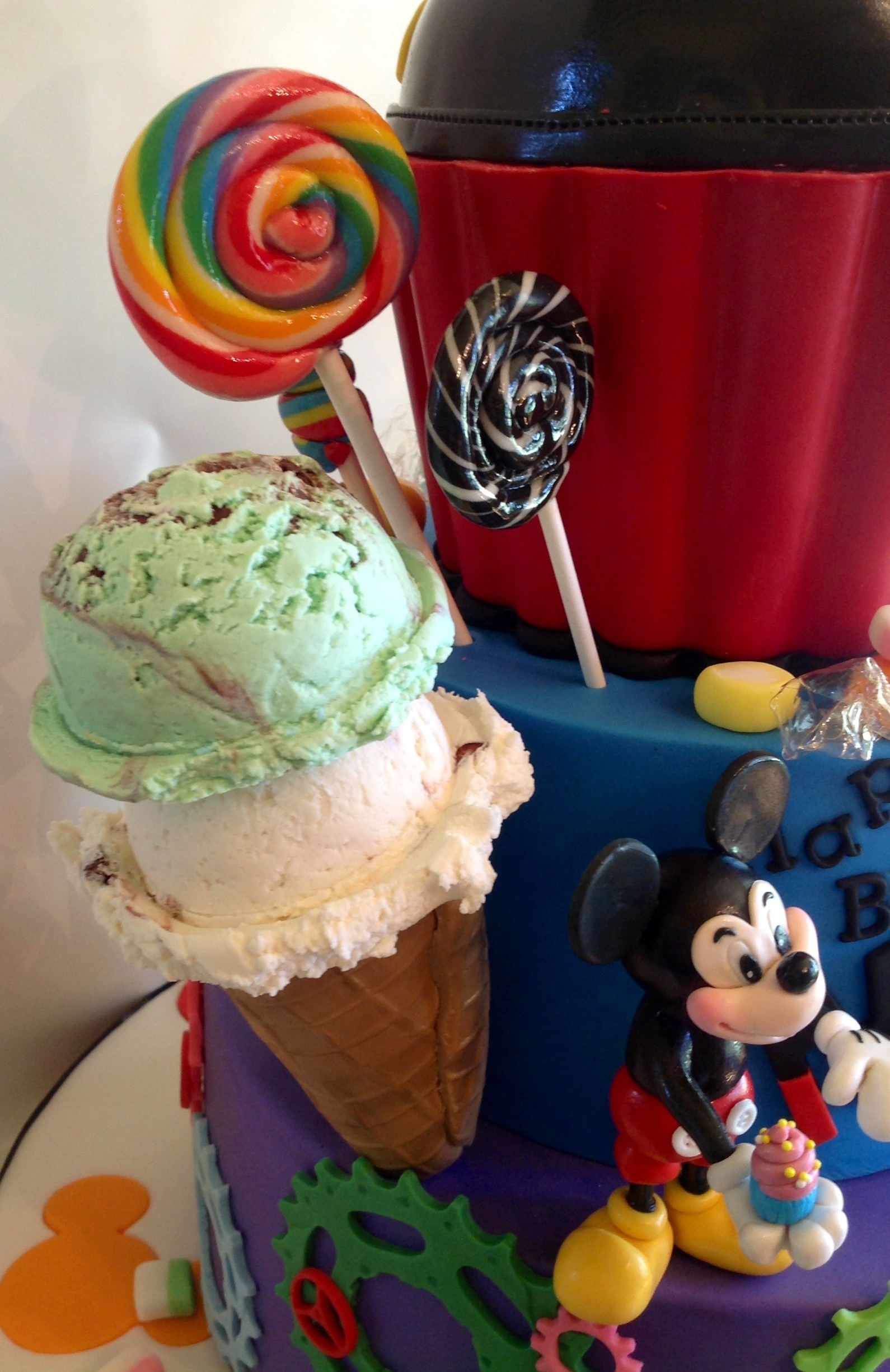 All decorations edible art including ice cream, cupcakes, candy, candy wrappers, hat, and Mickey. Fun cake to make for a special little boy's first birthday.