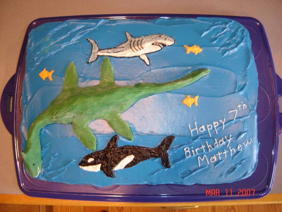 My son wanted a "sea monster" cake. He also requested the great white and killer whale. My favorite is the great white. I made the sea monster using candy clay made from green candy melts. This was my time using the clay. Although I like the monster, the clay wasn't stiff enough to have his head stay up. Any tips on working with candy clay would be appreciated. Thanks for looking.