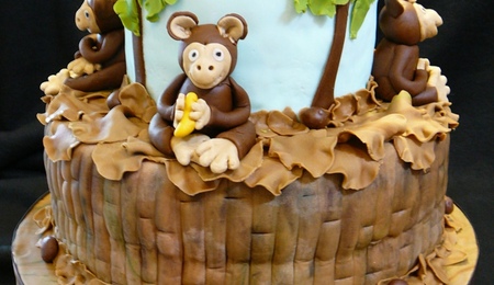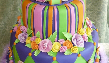 A cake made for a bridal shower, hosted by my daughter-in-law. The bottom tier is white chocolate cake, filled with white chocolate ganache and raspberry filling. The top two layers are chocolate cake, filled with chocolate ganache and buttercream. All layers are covered with MFF and decorated with gumpaste/MFF flowers - with rhinestone button centers, and bling ribbons. The cakes are 10"/7"/4".