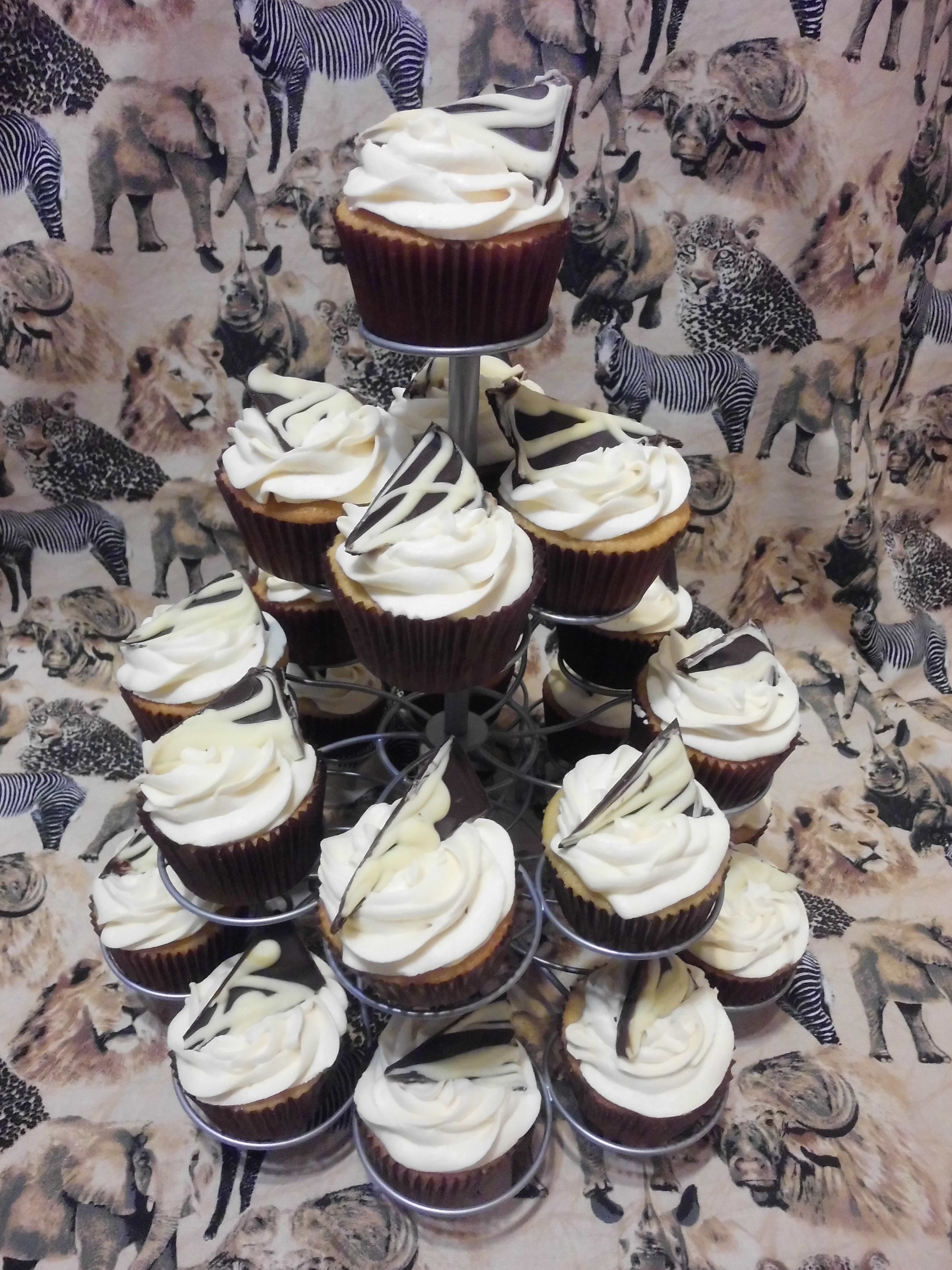 Vanilla cupcakes with cream coloured butter icing, decorated with white and dark chocolate shards for a wild animal theme.