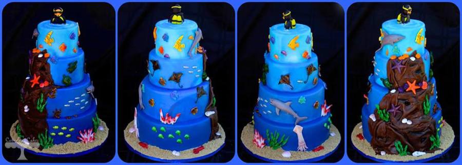 Each tier of this cake represents a different layer of the ocean and the sea life that would love there. From bioluminescent fish to bright coral sitting on the wall, this cake has it all. Thanks for looking!