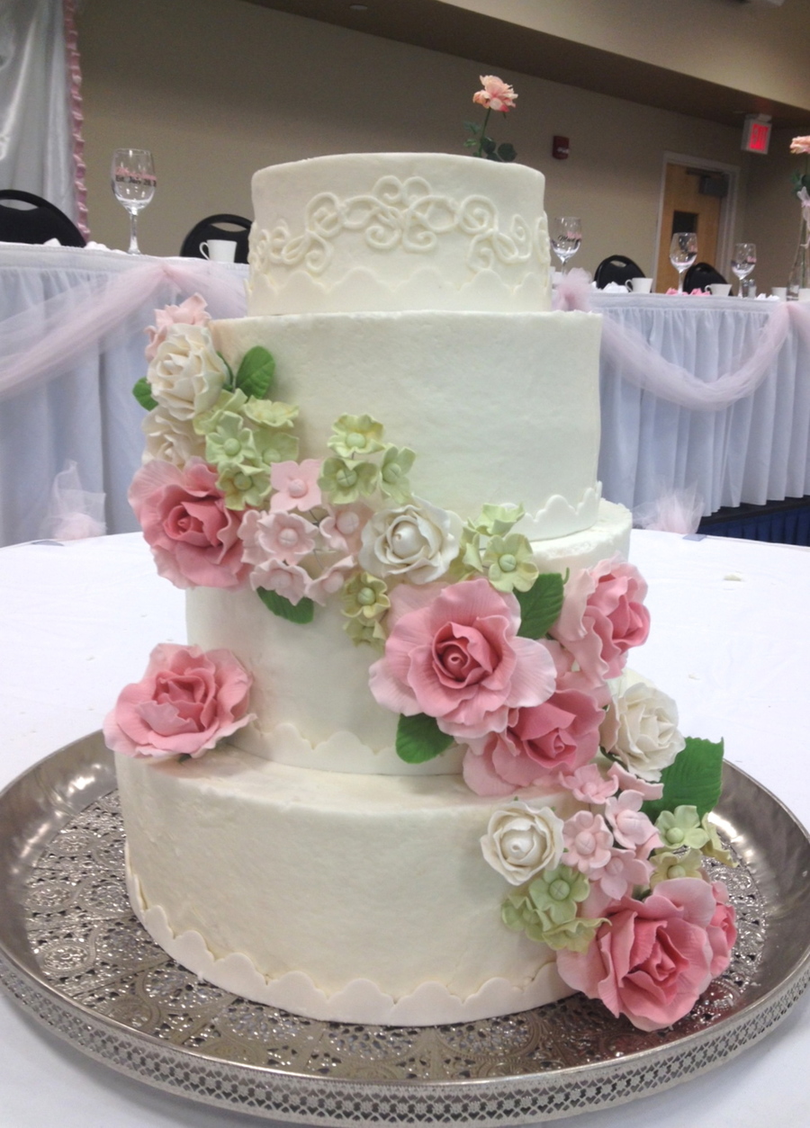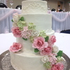 Garden party wedding cake with pink an white roses and green and pink hydrangeas.